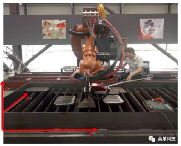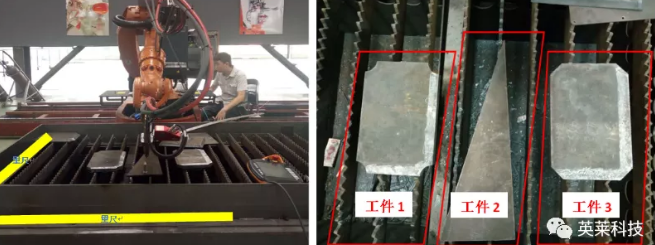 ● 現(xiàn)場(chǎng)的設(shè)備:KUKA C4系統(tǒng)、英萊激光視覺(jué)焊縫跟蹤系統(tǒng)、割炬、落料臺(tái)等。