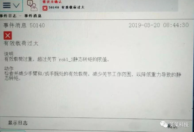 經(jīng)技術(shù)人員進(jìn)行現(xiàn)場(chǎng)狀態(tài)確認(rèn),機(jī)器人未與設(shè)備和工件等物體發(fā)生碰撞,排除由于卡滯和碰撞造成的轉(zhuǎn)矩或負(fù)荷過(guò)高。機(jī)器人動(dòng)作監(jiān)控被觸發(fā),機(jī)器人機(jī)械單元的移動(dòng)被立即中斷。